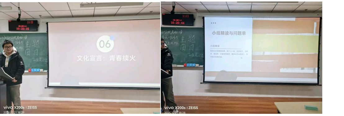 2025级工商管理类(企业管理方向)五班团支部以一场庄重温润的“经典诵读会”为核心,打破刻板的集体朗诵形式,着力营造沉浸式氛围。在领诵人的带领下,整齐的诵读声仿佛穿越时空;自由演绎环节中,同学们或激昂或深沉地朗诵心仪篇章。当千年文字经由当代青年之口再度响起,一种跨越时空的情感联结与文化共鸣悄然形成,使员工真切触摸到中华文脉的跃动。